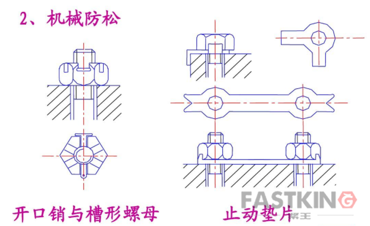 第二種方式是機(jī)械防松。是用止動件直接限制螺紋副的相對轉(zhuǎn)動。如采用開口銷、串連鋼絲和止動墊圈等。這種方式造成拆卸不方便。
