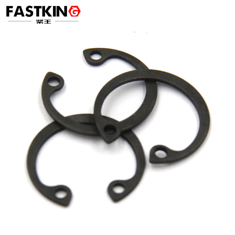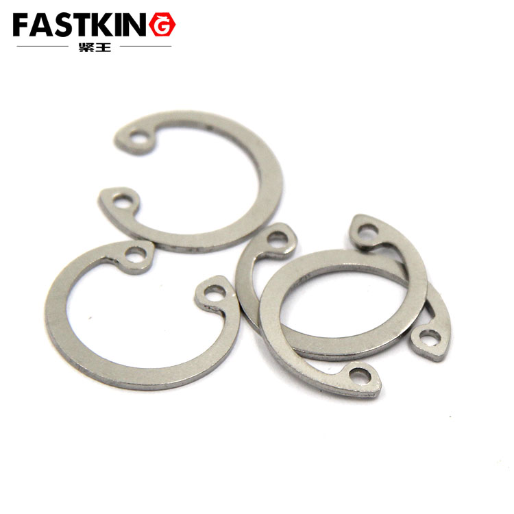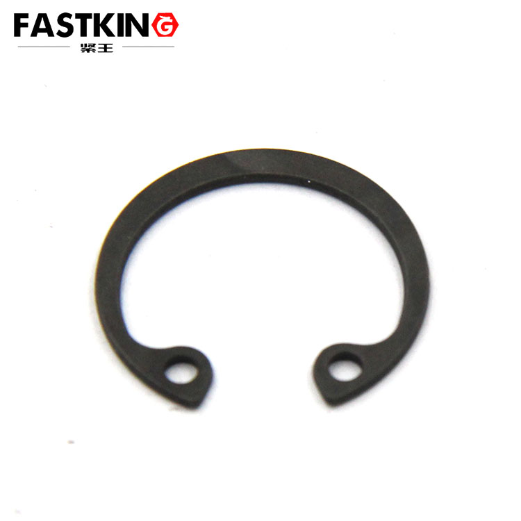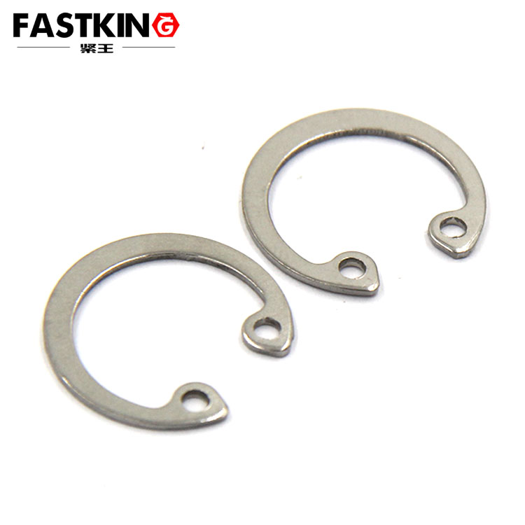 孔用彈性擋圈,安裝于圓孔內,用作固定零部件的軸向運動,這類擋圈的外徑比裝配圓孔直徑稍大。安裝時須用卡簧鉗,將鉗嘴插入擋圈的鉗孔中,夾緊擋圈,才能放入預先加工好的圓孔內槽。