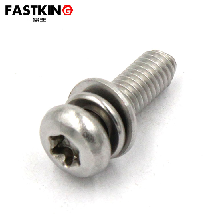結(jié)構(gòu)構(gòu)成:由盤頭內(nèi)梅花螺絲(核心承載部件)、平墊圈(分散壓力,保護被連接件表面)、彈墊圈(提供彈性預緊,防止振動松動)組成,三者通過沖壓或鉚接工藝預組裝為一體,出廠時已確保同軸度(誤差≤0.1mm),避免安裝時墊圈偏移;